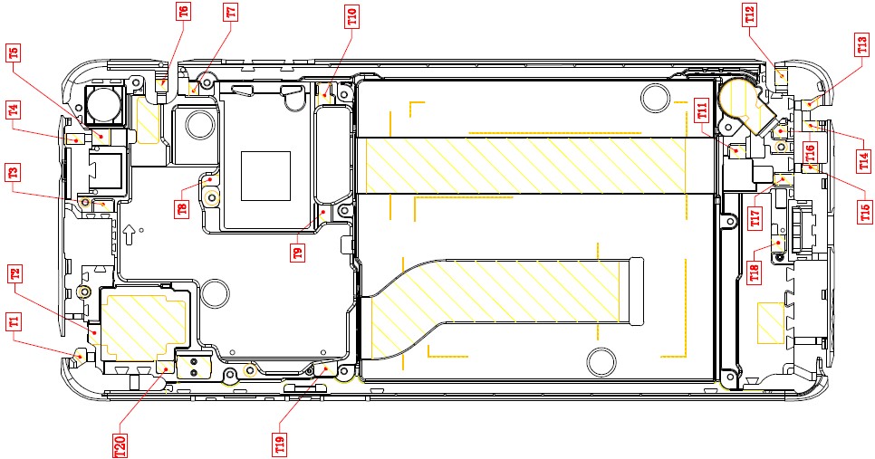 4、鐳雕區T1~T19為天線鐳雕區,G1~G36為鐳雕接地區域,鐳雕工藝必須滿足Moto可靠性測試標準;
